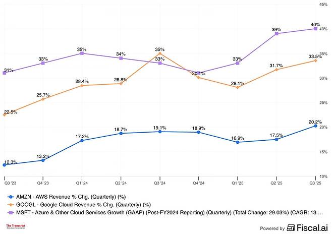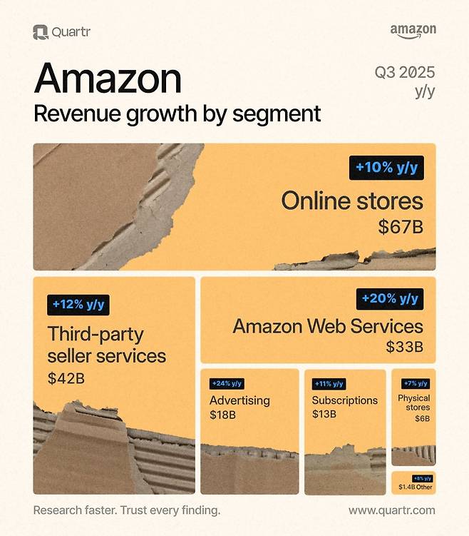 아마존은 분기 매출이 13% 증가했고요. 순이익은 38% 늘었습니다. 특히 클라우드 사업인 아마존웹서비스(AWS) 매출은 20.2% 성장해 월가 예상 18.1%를 웃돌았습니다. 2022년 말 이후 가장 높은 증가율입니다.