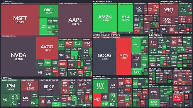 아마존은 9.58% 폭등하면서 끝까지 오름세를 유지했습니다. 하지만 애플은 -0.38% 하락세로 마감했고요. 엔비디아도 -0.20% 내렸습니다. 메타는 -2.72% 떨어지면서 이틀째 큰 폭 내림세를 이어갔습니다. 마이크로소프트도 역시 -1.51% 하락해 이틀 연속 내렸습니다.