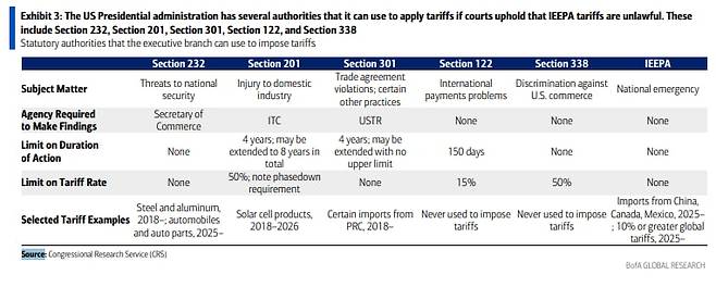 11월 5일도 지켜봐야 합니다. 연방대법원은 국제비상경제권한법(IEEPA)에 의해 부과한 관세에 대한 심리를 진행할 예정입니다. 트럼프 행정부가 ‘관세 부과 조치 중 상당수가 불법’이라고 판결한 하급 법원 판결을 뒤집어달라고 상고했기 때문입니다. 트럼프 대통령 본인도 변론에 참석할 수 있다고 했죠. 연말 이전에 판결이 내려질 가능성이 있습니다. 골드만삭스는 올해 단행된 관세 인상 대부분이 법원에서 뒤집힐 수 있는 법적 근거에 의존하고 있다고 지적하면서도, 트럼프 행정부가 다른 수단으로 신속히 전환할 것으로 전망했습니다. 가능한 옵션으로는 7개월 동안 최대 15%의 관세를 부과할 수 있도록 허용하는 122조가 있고요. 2018~2019년에 대중국 관세 부과에 활용됐던 301조도 있습니다. 301조를 활용하면 현재 IEEPA에 따라 특정 국가에 부과된 관세를 대체할 수 있는데요. 골드만은 모든 교역 상대국을 대상으로 301조 조사를 개시하는 것은 번거롭고, 만약 대법원이 IEEPA 기반 관세를 무효로 만든다면 소규모 국가에 대한 관세는 없어질 수 있다고 봤습니다.