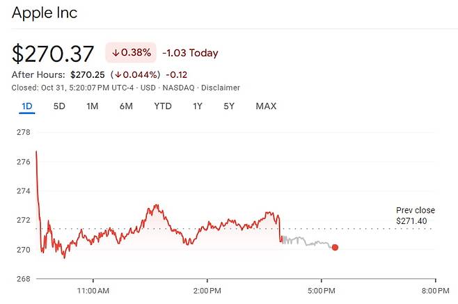 애플 주가는 1.8% 상승세로 출발했는데요. 오름세를 오랫동안 유지하지는 못했습니다. 아침 9시 40분이 지나자 거의 보합 선을 오르내렸습니다. 애플의 케반 파레크 CFO는 어제 콘퍼런스콜에서 "AI 투자를 크게 늘리고 있다"라며 12월 분기 운영비가 181억~185억 달러 사이가 될 것이라고 밝혔습니다. 이에 대해 몇몇 애널리스트들은 부정적인 반응을 보였습니다.
