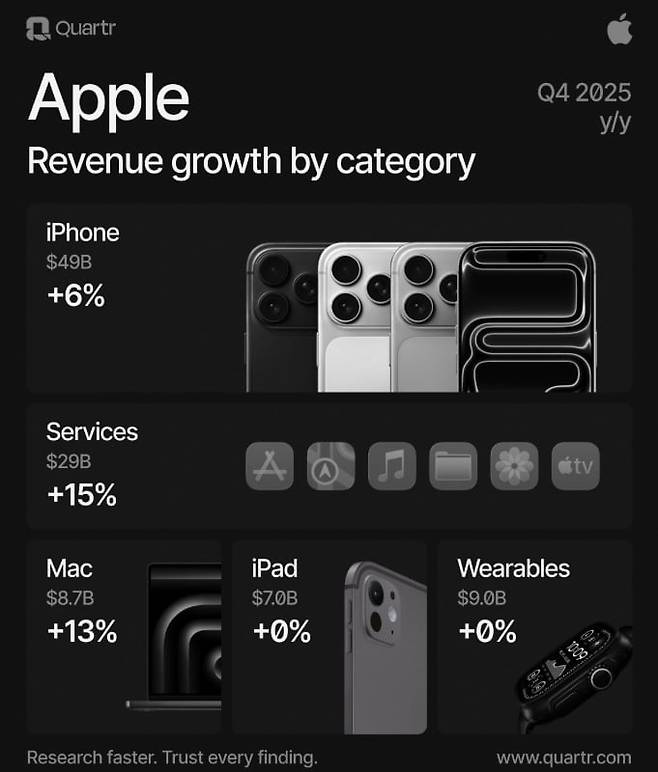 애플은 지난 분기 매출이 8% 증가해 역대 기록을 세웠습니다. 중화권 매출이 3.6% 감소한 게 흠이었지만, 서비스 매출이 15% 급증해 이를 상쇄했습니다. 아이폰 매출은 490억 달러로 5% 증가했지만, 월가 예상(500억 달러)에 미치지 못했습니다. 하지만 팀 쿡 CEO는 여러 모델에서 공급 부족을 겪었다며, 이번 분기엔 매출이 10~12% 증가할 것으로 예상했습니다. 이는 월가 예상 6%보다 훨씬 높은 수치입니다.
