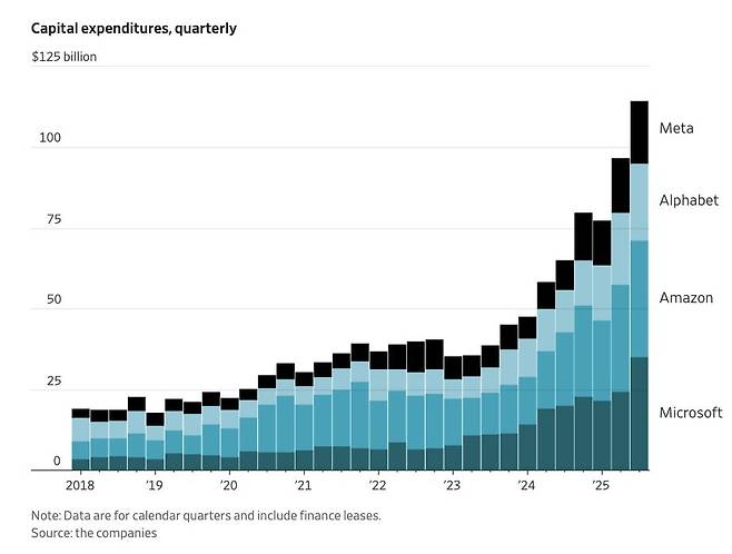 실적을 발표한 아마존, 마이크로소프트, 메타 등은 막대한 AI 투자를 지속할 것임을 밝혔습니다. 아마존은 "올해 내년 자본지출이 1250억 달러에 이를 것이며, 이 금액은 2026년에 증가할 것으로 예상한다"라고 밝혔죠. 모건스탠리는 "빅테크들의 데이터센터 지출은 2026년 5910억 달러, 2027년에는 7000억 달러에 이를 것으로 예상된다"라고 분석했습니다.