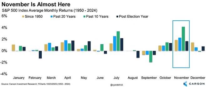 게다가 원래 11월은 계절성이 좋은 달입니다. 스톡트레이더스연감에 따르면, 1950년 이후 11월은 S&P500 지수가 평균 1.8% 올랐습니다. 12개월 중 가장 좋은 수익률입니다. 대선 이후 연도에는 평균 1.6% 상승률을 보이면서 세 번째로 좋은 달을 기록했고요.