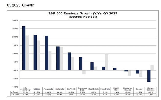 이번 주까지 S&P500 종목의 64%가 3분기 실적을 보고했습니다. 이 중 83%가 추정치 이상의 EPS를 공개했는데요. 이는 5년 평균 78%와 10년 평균 75%를 웃도는 수치입니다. 전체적으로 기업들은 추정치보다 5.3% 높은 이익을 보고했는데요. 이는 5년 평균 8.4%와 10년 평균 7.0%보다 낮은 수치입니다. 아직 실적을 보고하지 않은 기업의 예상 실적을 합산한 혼합 실적 성장률은 10.7%입니다.
