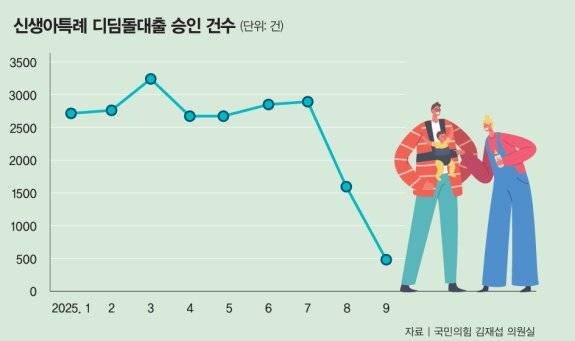 6억 원 이하 주택을 구하기도 어려운데 대출 규제까지 겹치면서 디딤돌대출 승인 건수는 급감했다. 국회 정무위원회 소속 국민의힘 김재섭 의원이 주택도시보증공사(HUG)로부터 제출받은 자료에 따르면 9월 신생아특례 디딤돌대출 승인 건수는 476건으로 지난해 1월 제도 시행 이후 처음으로 1000건 아래로 떨어졌다(그래프 참조). 6·27 대책이 발표된 6월(2842건)과 비교하면 석 달 만에 2366건(83.3%) 줄어든 셈이다. 올해 초까지만 해도 디딤돌대출 승인 건수는 월 2600~3300건대를 유지했다. 그러나 8월 들어 1585건으로 감소했고, 9월에는 500건 미만으로 쪼그라들었다. 이재명 정부의 첫 부동산 대책인 6·27 대출 규제 시행 이후 석 달 만에 나타난 변화다.정책대출 예산도 빠르게 줄고 있다. 내년도 정부 예산안에서 주택 구입 및 전세자금 대출 융자 예산은 올해 14조571억 원에서 10조3015억 원으로 3조 원 이상 감액됐다. 정부는 여기에 더해 조정대상지역과 투기지역의 디딤돌대출을 전액 은행 재원으로 취급할 것을 시중은행에 통보했다. 원래 디딤돌대출은 정부의 주택도시기금으로 직접 취급하거나 은행이 먼저 대출한 뒤 시중금리와의 차이를 정부가 보전하는 구조였다. 그러나 10·15 부동산 대책에 따라 서울 전역과 경기 과천·분당 등으로 규제지역이 확대되면서 정부의 자금 부담이 커지자 해당 책임을 은행에 넘긴 것이다.