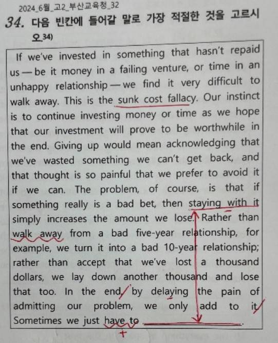 | ▲ 이미 투자한 것이 아까워 쉽게 그만두지 못하는 '매몰비용'의 오류를 다룬 모의고사 영어 지문 |