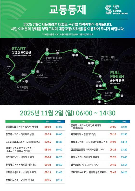 보다 정확한 통제 시간과 우회 구간 등은 120다산콜센터(국번 없이 ☎120)나 JTBC 서울마라톤 홈페이지(marathon.jtbc.com)를 참고하면 된다.