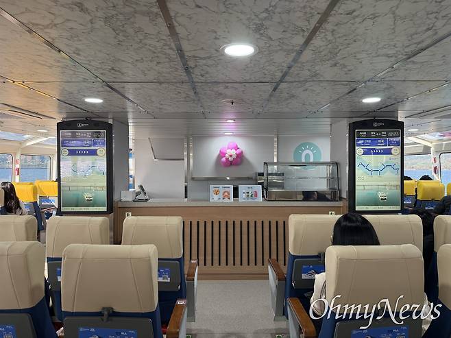 | ▲ 1일 운항을 재개한 한강버스에 안전수칙 영상 등이 나오는 디스플레이 2개가 비치돼 있다. |