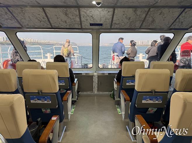 | ▲ 1일 운항을 재개한 한강버스의 선수를 포함한 좌석 40개에서는 안전수칙 영상이 나오는 디스플레이를 볼 수 없다. |