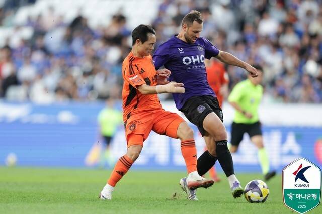 울산이 1일 오후 4시 30분 안양 종합운동장에서 FC안양과 하나원큐 K리그1(1부) 2025 35라운드 경기를 치르고 있다. 고승범이 장군을 부르자, 모따가 멍군으로 응수했다. 전반전 스코어는 1-1이다.