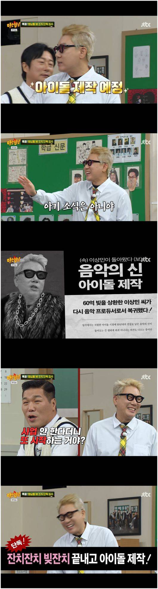 그러나 이상민은 “나도 최초가 있다. 임신 소식은 아니다. 아이돌 제작을 한다”라며 황급히 손을 내저었다. 그러자 강호동은 “빚 잔치 끝나고 아이돌 제작이냐”라면서 지적했고, 서장훈은 “사업 안 한다고 하더니 또 사업을 하냐”라고 말하며 걱정을 보였다/osen_jin0310@osen.co.kr