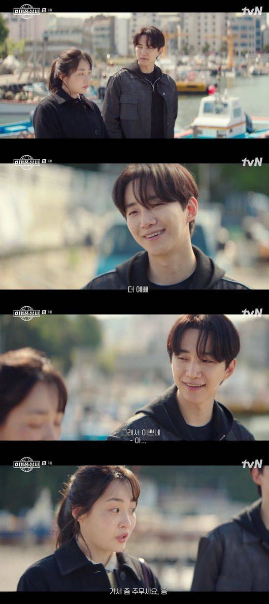 강태풍이 배에 타 있는 사이 오미선은 걱정에 직접 튜브를 들고 바다에 뛰어들 작정이었다. 결국 무사히 만난 강태풍은 오미선에게 “나 오 주임님 좋아하는 것 같다. 지금 주임님 되게 더럽고 꾀죄죄한데 근데 이쁘다. 생각해 보니까 맨날 똑같은데 전점 더 청순해지는 것 같아. 화낼 때는 귀엽고 웃을 때는 더 예쁘다. 그렇네. 나 주임님 좋아하네. 그래서 예쁘네”라고 고백했다. 오미선은 강태풍의 고백에 당황하면서도 쑥스러운 듯 웃었다. /seon@osen.co.kr