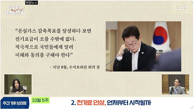 ◇ 최서윤> 네, 우선 대선이 한창이던 올해 5월로 거슬러 가보겠습니다. 이재명 당시 대선 후보가 전북 전주 유세 현장에서 "경제 상황이 너무 나빠서 전기 요금을 당장 손대기는 어렵지만 장기적으로 올릴 수밖에 없는 현실"이라는 견해를 밝혔습니다. 정부 출범하고 이 이야기를 다시 꺼낸 게 바로 8월이에요. 정부가 막바지 준비 중이던, 시급 현안이던 '2035년 온실가스감축목표(NDC)' 준비 상황 점검하는 수석 보좌관 회의를 대통령실에서 했는데요. 치열한 토의 끝에 "온실가스 감축 목표를 달성하다 보면 전기요금이 오를 수밖에 없으니, 이를 국민에게 적극적으로 알려서 이해와 동의를 구해야 한다"고 의견 정리를 한 걸로 전해졌어요.