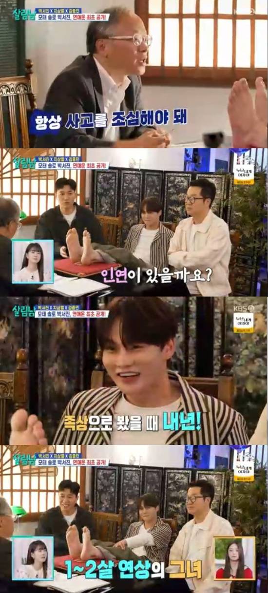 김백문은 "족상으로 봤을 때는 내년 6월이나 9월이다. 1, 2살 위의 연상하고 인연이 있다"고 말했다. 직업군은 박서진처럼 가수나 연예인일 확률이 높다고.
