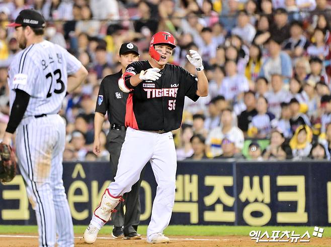 오선우는 사령탑과 어떤 이야기를 나눴을까. 오선우는 "타구를 정면으로 쫓아가는 습관이 있었다. 빠른 타구가 오면 뒤로 넘어졌는데, 다리를 좀 움직이면서 공간을 확보하려고 연습하고 있다"며 "감독님도 공간을 만들어야 한다고 조언해 주셨다"고 설명했다.