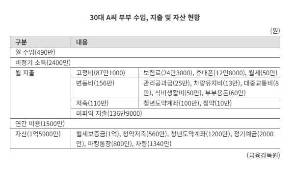 30대 A씨 부부 월 수입은 490만원이다. 연간 비정기 수입은 2400만원이다. 월 지출은 353만1000원이다. 고정비가 보험료(24만3000원), 휴대폰(12만8000원), 월세(50만원) 등 87만1000원이 든다. 변동비는 관리공과금(25만원), 차량유지비(13만원), 대중교통비(8만원), 식비생활비(50만원), 부부용돈(60만원) 등 156만원이다. 저축은 청년도약계좌(100만원), 청약(10만원) 등 110만원씩 하고 있다. 미파악 지출은 136만9000원이다. 연간 비용은 1500만원이다. 자산은 월세보증금(1억원), 청약저축(560만원), 청년도약계좌(1200만원), 정기예금(2000만원), 파킹통장(800만원), 차량(1340만원) 등 1억5900만원이다. 부채는 별도로 없다.
