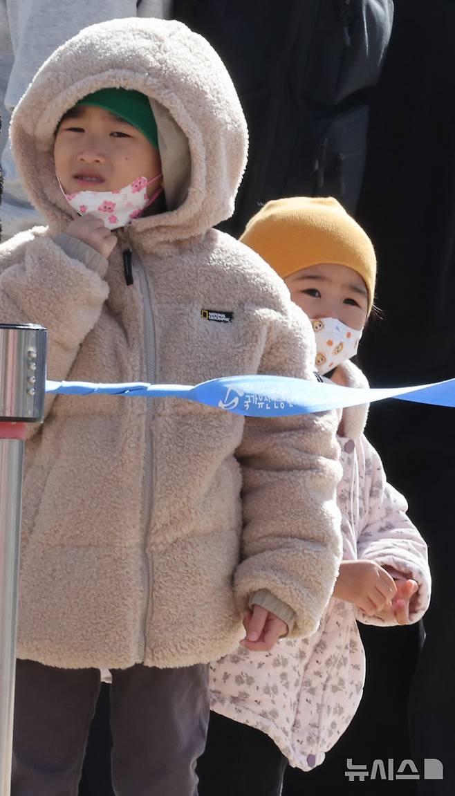 차가운 바람에 겨울옷 입고 관람하는 어린이들