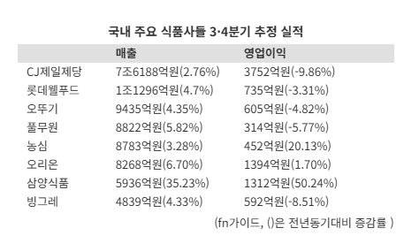 2일 금융정보업체 에프앤가이드에 따르면 이달 중 식품 업계의 올해 3·4분기 실적 공시가 예정된 가운데 식품 업체 8곳 중 절반 이상의 3분기 영업이익이 전년 동기대비 감소할 것으로 전망됐다.