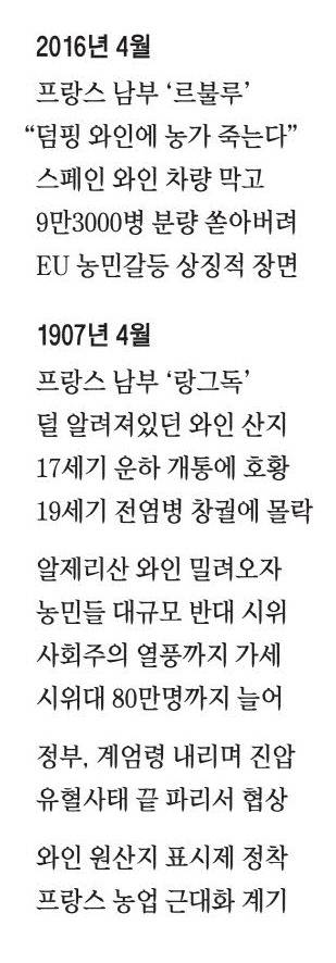 재밌는 사실은 이 사건이 발생한 프랑스 남부 랑그독 지역에선 100여 년 전에도 '와인'을 매개로 비슷한 사건이 일어났다는 점입니다. 물론 그때는 단순히 와인을 버리는 정도로 끝나지 않았습니다. 정부가 생산자들의 집회·시위를 반란으로 규정했고, 군대가 출동해 진압하는가 하면 유혈사태도 발생했거든요. 프랑스 역사책에도 기록된 1907년 랑그독 와인 반란 사건입니다.