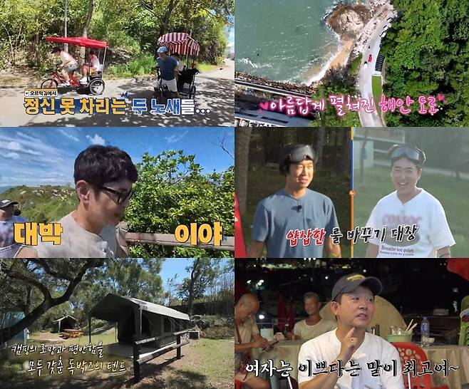 환장의 티키타카 속, 트레킹을 마친 ‘독박즈’는 이후 홍인규가 예약한 글램핑 숙소로 갔다. 작은 보트를 타고 이동한 숙소에는 다양한 야외 게임을 즐길 수 있는 장소들이 마련돼 있었고, ‘독박즈’는 양궁 게임, 발로 차는 포켓볼 게임을 하면서 ‘보트비’, ‘저녁 식사비’ 독박자를 뽑았다. 그 결과 홍인규와 김대희가 꼴찌를 해 ‘1독’씩을 적립했다.