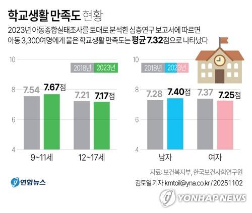 (서울=연합뉴스) 김토일 기자 = 2일 보건복지부와 한국보건사회연구원이 2023년 아동종합실태조사를 토대로 분석한 심층연구 보고서를 보면 아동 3천300여명에 대한 설문 결과 학교생활 만족도는 평균 7.32점으로 나타났다.