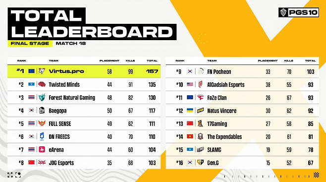 버투스 프로는 2일(한국시간) 말레이시아 세렘반의 카리스마 아레나에서 열린 펍지 글로벌 시리즈(PGS) 10 결승(파이널) 3일 차 경기(매치13~18)에서 47점을 추가하며 도합 157점을 누적, 정상을 차지했다.