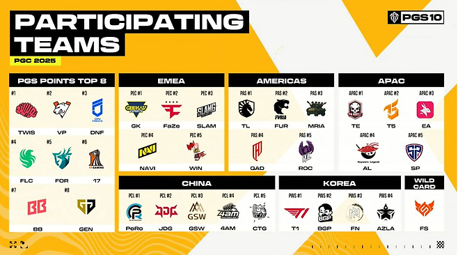 PGS는 크래프톤에서 주최하는 배틀그라운드 국제 e스포츠 대회다. 한국, 중국, 유럽, 아시아태평양, 아메리카 등 각 권역에서 총 24개 프로팀이 참가해 해당 시즌 최강팀의 영예와 연말 열리는 ‘펍지 글로벌 챔피언십(PGC)’ 진출권을 두고 경쟁한다. 이번 PGS10 총 상금은 30만 달러(약 4억원)다.