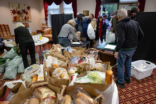 지난달 30일 미국 켄터키주 루이빌의 한 구호단체가 주민들에게 식자재를 무료로 나눠주고 있다(위 사진). 1일 뉴욕의 한 푸드뱅크에도 무료 음식을 받으려는 시민들이 긴 줄을 서서 대기하고 있다. 지난달 1일부터 계속된 연방정부의 ‘셧다운’(일시 업무 정지) 여파로 미국인들의 생활고가 심해지고 있다는 평가가 나온다.