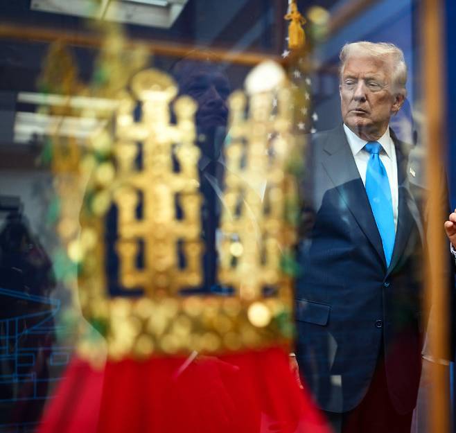 | 신라 금관 도널드 트럼프 미국 대통령이 한미 정상회담에서 선물로 받은 천마총 금관 모형에 대해 설명을 듣고 있다. 사진출처 X |