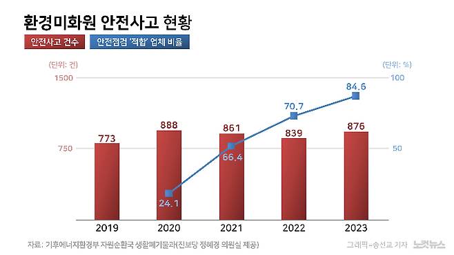 CBS노컷뉴스가 진보당 정혜경 의원실로부터 확보한 기후에너지환경부(환경부) 자료에 따르면, 환경미화원 안전사고 건수는 2019년 773건, 2020년 888건, 2021년 861건, 2022년 839건, 2023년 876건이었다. 2020년부터는 매년 800건 이상씩 꾸준히 사고가 나고 있다.