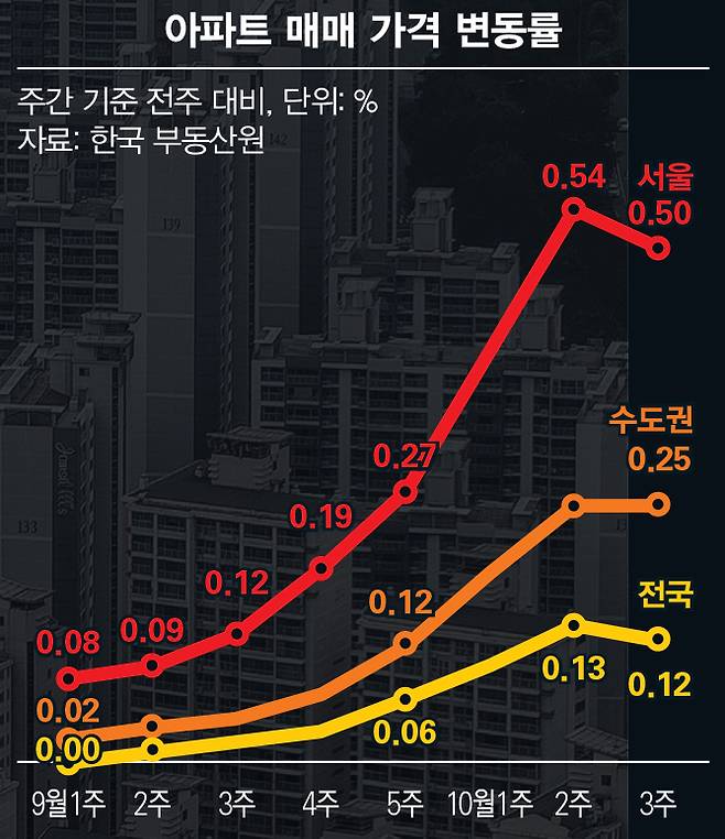 한국부동산원이 발표한 전국 주간 아파트 가격 동향에 따르면, 5일장 여파가 나타난 10월20일 기준 서울 아파트 매매가는 전주 대비 0.5% 상승해 2월 이후 38주 연속 상승세를 기록했다. 1% 넘게 뛴 것으로 나타난 광진구와 성동구를 비롯해 서울 25개 자치구의 아파트값이 모두 상승한 것으로 집계됐다.