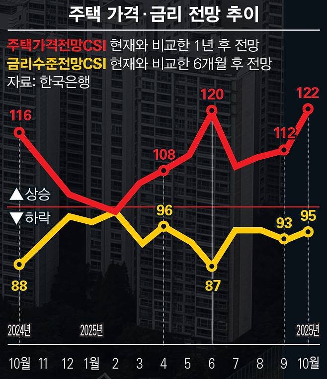 정부의 대책에도 시장은 여전히 부동산 상승 전망에 무게를 싣는다. 한국은행이 10월28일 발표한 '소비자동향조사' 결과에 따르면, 10월 주택가격전망지수는 122로 전월보다 10포인트(p) 상승했다. 이는 문재인 정부였던 2021년 10월(125) 이후 4년 만에 최고치다. 주택가격전망지수는 현재와 비교한 1년 후 전망을 반영한다. 지수가 100을 웃돌면 집값 상승을 예상하는 소비자가 하락을 예상하는 소비자보다 더 많다는 뜻이다. 단기적으로 반복되는 부동산 규제 정책으로는 집값 상승에 실질적인 제동을 걸기 어려울 것이란 전망이 우세하다는 의미다.