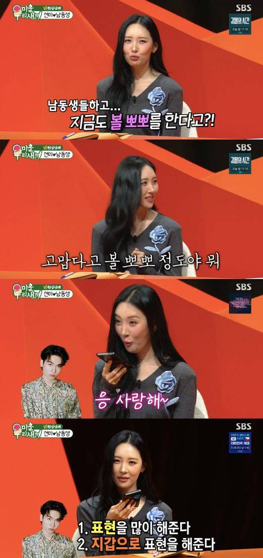 신동엽은 “그거 멋있는 거다. 쑥스러워 할 필요 없다”라며 누나 장점 3가지라고 물었다. 남동생은 선미를 향해 “표현을 많이 해준다. 지갑으로 표현을 해준다. 언제나 내편이라는 점”이라고 답해 훈훈함을 자아냈다.