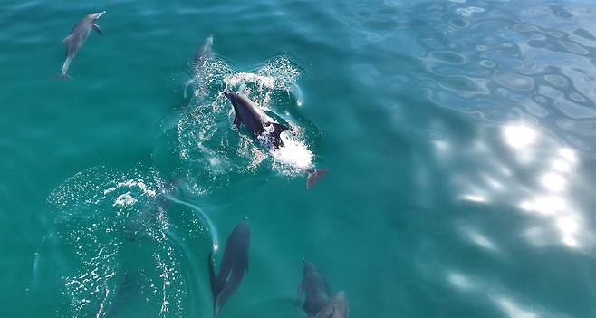 | ▲ 추석 연휴를 하루 앞둔 2일 오전 제주 서귀포시 대정읍 일과리 앞바다에서 남방큰돌고래 무리가 유영하고 있다 |