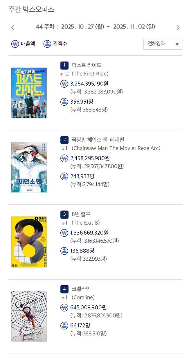한편, 전날 '퍼스트 라이드'에 이어 '극장판 체인소 맨: 레제편'이 50,010명의 관객을 동원하며 박스오피스 2위를 차지했다. 그 뒤로 '8번 출구'(31,903명), '코렐라인'(15,188명), '케이팝 데몬 헌터스'(14,670)가 박스오피스 상위권에 이름을 올렸다.