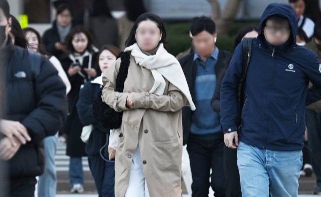 서울에 올해 첫 한파특보가 발효된 3일 시민들이 서울 여의도 여의대로에서 두꺼운 옷차림으로 출근하고 있다.