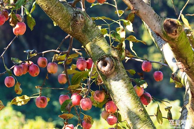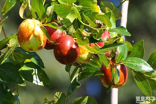 마당에 꽃사과, 텃밭에 꾸지뽕, 눈깔사탕만 한 대추가 주렁주렁 달렸습니다.