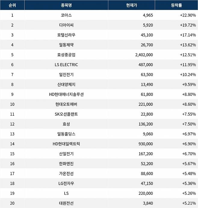 6위 LS ELECTRIC(010120)은 현재가 487,000원으로 11.95% 상승 중이다. 7위 일진전기(103590)는 현재가 63,500원으로 10.24% 상승 중이다. 8위 신대양제지(016590)는 현재가 13,490원으로 9.59% 상승 중이다. 9위 HD현대에너지솔루션(322000)은 현재가 61,800원으로 8.80% 상승 중이다. 10위 현대오토에버(307950)는 현재가 221,000원으로 8.60% 상승 중이다.