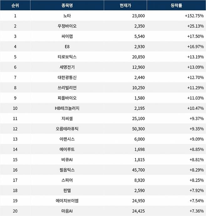 이밖에도 지씨셀(144510) ▲9.37%, 오름테라퓨틱(475830) ▲9.35%, 이랜시스(264850) ▲9.09%, 에이루트(096690) ▲8.85%, 비큐AI(148780) ▲8.81%, 필옵틱스(161580) ▲8.29%, 스피어(347700) ▲8.25%, 핀텔(291810) ▲7.92%, 에이치브이엠(295310) ▲7.54%, 마음AI(377480) ▲7.36% 등을 기록하며 시장에서 활발히 거래되고 있다.