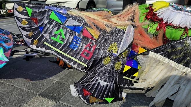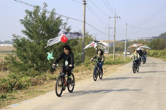 | ▲ 참가자들은 오전 10시까지 삽교호 자전거터미널에 모여 시각예술가 서해영 작가가 제작한 새 형상의 조형물을 어깨에 메고 소들섬을 향해 출발했다. |