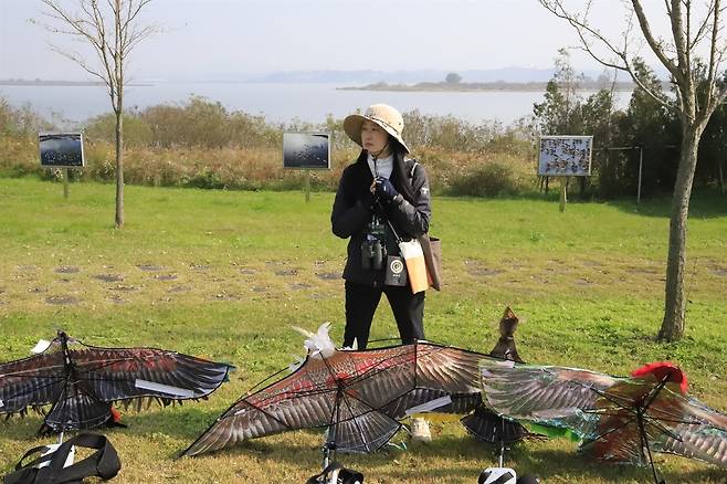 | ▲ 생태환경교육연구소 풀씨 김수정 대표가 소들섬 일원에서 참가자들에게 탐조 해설과 활동을 진행하고 있다. |
