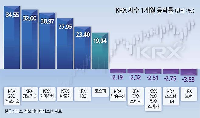 코스피 상승률보다 오른 KRX 섹터 지수는 35개 가운데 11개로 ▷KRX300정보기술(34.55%) ▷KRX정보기술(32.6%) ▷KRX기계장비(30.97%) ▷KRX100 (23.4% ▷KRX에너지화학(23.01%) 순이다.