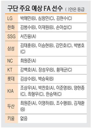 올겨울 FA 시장에는 예년 수준인 20명 내외의 선수가 나올 전망이다. FA 선수는 최근 3년간 평균 연봉과 평균 옵션 금액에 따라 등급을 A∼C등급으로 나누며, 등급별로 보상 규정이 다르다. A등급 선수를 영입한 구단은 보상선수 1명(보호선수 20명 외)과 전년도 연봉의 200% 또는 300%를 원소속팀에 지급해야 한다. B등급은 보상선수 1명(보호선수 25명 외)과 전년도 연봉의 100% 혹은 200%, C등급은 보상선수 없이 전년도 연봉의 150%를 지급한다.