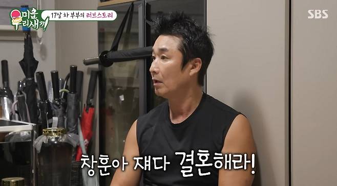 이창훈은 "잘돼가는 여자 있으면 늘 엄마께 보여드렸는데 항상 '둘이 알아서 해라' 하시며 탐탁지 않아 하셨다. 근데 이번엔 아내랑 식사 자리에서 엄마가 너무 좋아하시더라. 둘이 말도 많이 하고 웃음이 끊이지 않았다"라고 회상했다. 이어 "엄마가 '아무것도 필요 없다. 네가 그 여자를 업고만 와라. 숟가락도, 옷도 필요 없다. 네가 다 해줘라. 그러면 넌 나중에 행복할 거다'라고 하셨다. 그 말이 딱 맞았다. 지금까지 행복하게 살고 있다"라고 전했다.