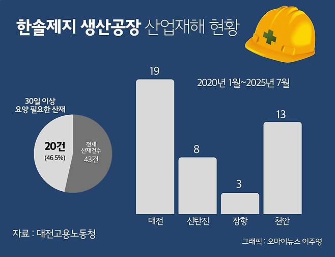 <오마이뉴스>가 대전고용노동청에 정보공개청구한 '2020년 1월~ 2025년 7월 한솔제지 생산공장(대전·신탄진·장항·천안) 산업재해조사표'를 분석한 결과, 한솔제지 생산공장 4곳에서는 지난 7월 사망사고를 포함해 모두 43건(신탄진공장 8건, 장항공장 3건, 천안공장 13건, 대전공장 19건)의 산재가 보고됐다. 이 중 상해로 30일 이상의 휴업이 필요하다고 판단된 사고만 20건(46.5%)이다.
