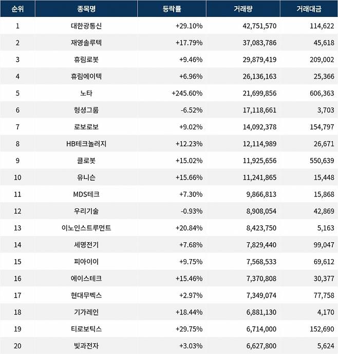 휴림로봇(090710)은 현재가 7,060원으로 9.46% 상승하며, 거래량 29,879,419주를 기록한다. 휴림에이텍(078590)은 26,136,163주의 거래량과 함께 현재가 999원으로 6.96% 상승 중이다. 노타(486990)는 21,699,856주가 거래되며, 31,450원의 현재가로 245.60%의 폭등률을 보인다. 헝셩그룹(900270)은 17,118,661주의 거래량과 215원의 현재가로 6.52% 하락 중이다. 로보로보(215100)는 10,880원의 현재가로 9.02% 상승하며, 거래량은 14,092,378주이다. HB테크놀러지(078150)는 2,230원의 현재가로 12.23% 상승 중이며, 거래량은 12,114,989주로 기록된다. 클로봇(466100)은 11,925,656주의 거래량과 함께 현재가 46,700원으로 15.02% 상승 중이다. 유니슨(018000)은 11,241,865주의 거래량을 기록하며, 1,411원의 현재가로 15.66% 상승하고 있다.