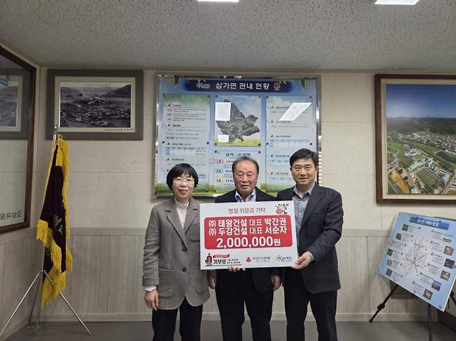 합천군 삼가면 어전리 출신인 태왕‧두강건설 박간권‧서순자 대표가 추석 명절을 맞아 준비한 위문금 200만원(각 100만원씩)을 최근 삼가면에 전달하며 명절이 지난 시기에도 변함없는 이웃사랑을 전했다.