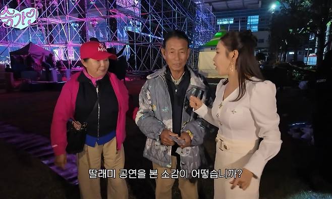 이날 영상 속에서 송가인은 전남 도민의 날 행사 무대에 오르며 관객들을 만났다. 현장에는 송가인의 부모가 직접 방문해 딸의 무대를 응원하는 모습이 담겼다.
