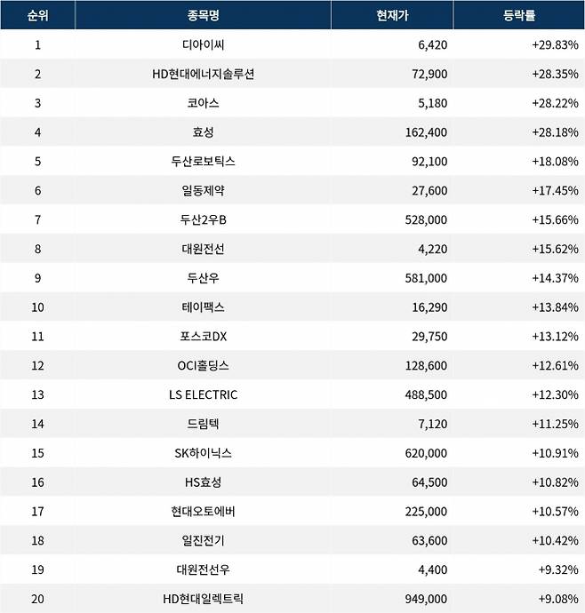 이어 상승률 2위 HD현대에너지솔루션(322000)은 주가가 28.35% 폭등하며 종가 72,900원에 상승 마감했다. 상승률 3위 코아스(071950)의 주가는 5,180원으로 28.22% 폭등하며 주목받았다. 상승률 4위 효성(004800)은 28.18% 폭등하며 162,400원에 마감했다. 상승률 5위 두산로보틱스(454910)는 18.08%의 급등세를 타고 종가 92,100원에 마감했다.