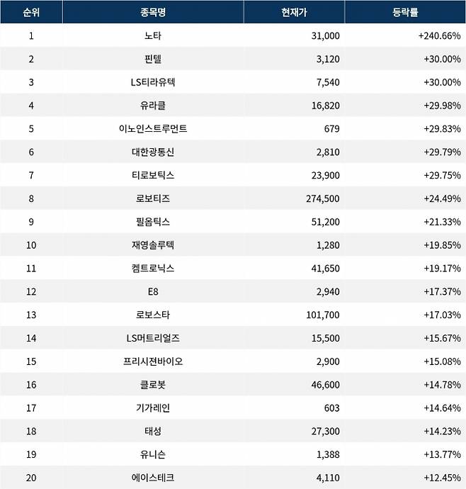 6위 대한광통신(010170)은 종가 2,810원으로 +29.79% 상승 마감했다. 7위 티로보틱스(117730)는 종가 23,900원으로 +29.75% 상승 마감했다. 8위 로보티즈(108490)는 종가 274,500원으로 +24.49% 상승 마감했다. 9위 필옵틱스(161580)는 종가 51,200원으로 +21.33% 상승 마감했다. 10위 재영솔루텍(049630)은 종가 1,280원으로 +19.85% 상승 마감했다.